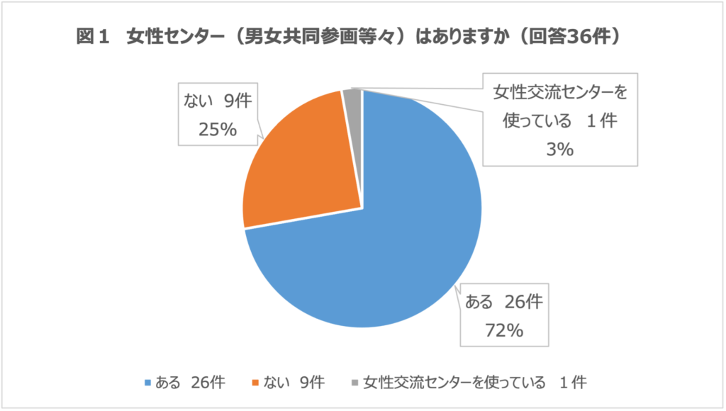 回答数は36件。回答のうち、女性センターがない自治体が10件ありました(図1)。設置がなくてもアンケートに答えてくださったということは、常日頃から女性センターがないことへの問題意識があり、設置を提案・要望するなどコミットをされてきた方と想像されます。ありがとうございます。