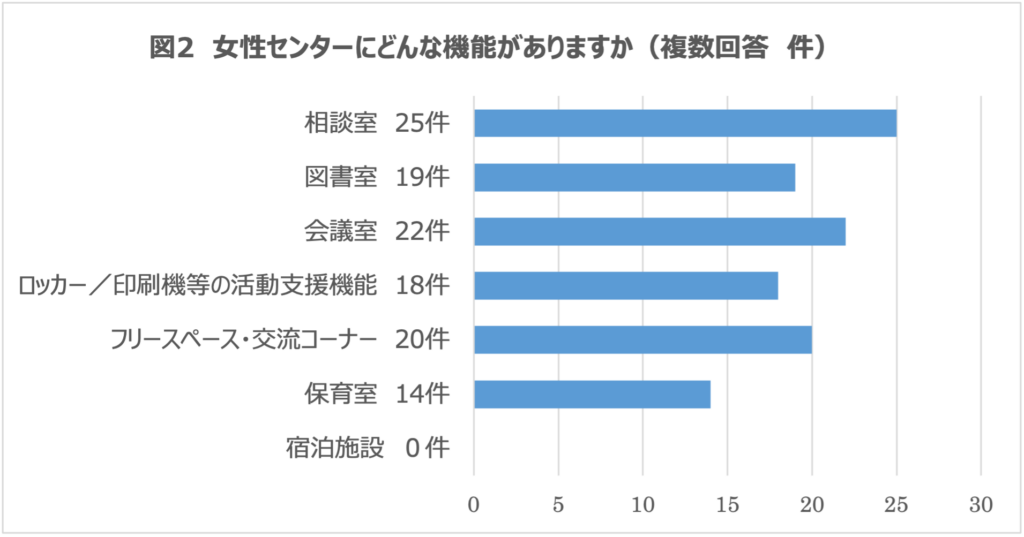 ・センターの機能として、多くが相談室や貸し部屋事業としての会議室を持っています(図2)。市民団体用のロッカーはあっても、印刷機能がないところもあります。女性センターの設置目的の一つは団体活動支援ですから、何が必要機能であるか検討が求められます。