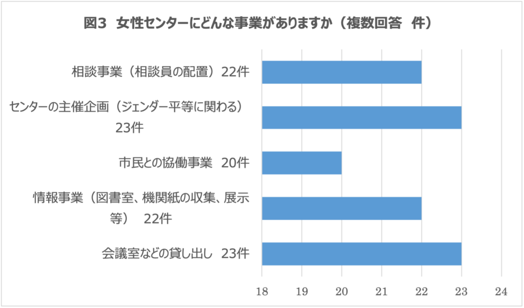 ・センターで行っている事業は、会議室貸し出しならびに主催企画事業が最も多く、次に相談事業、情報事業です(図3)。相談事業については、2024年「困難な問題を抱える女性への支援に関する法律」(以下困難女性支援新法)が施行され、そこに相談支援施設の設置が明記されました。これまで女性の相談を受けてきた女性センターとこの困難女性支援新法に基づく女性相談との連携等を今後どのようにしていくのか、センター設置自治体の大きな課題です。