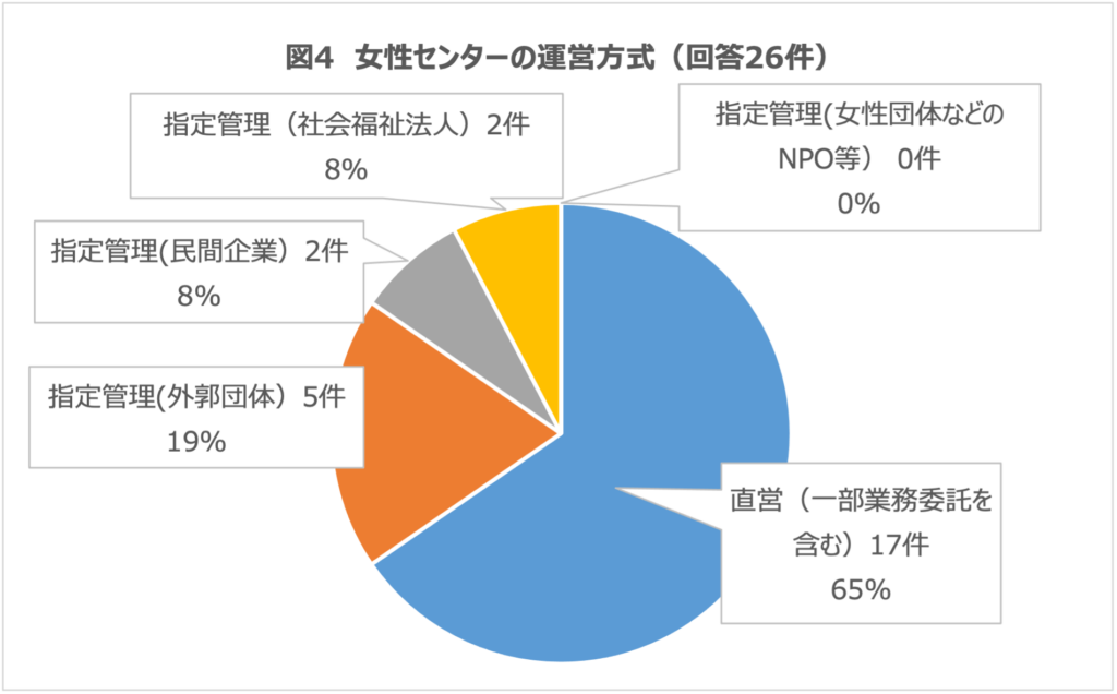 ・運営体制は、直営が多いです(図4)。アンケート内容にはありませんが、報道などにもあるように、センターの職員や相談員については、非常勤や会計年度任用職員、再任用職員等が多いことは他の調査等からもうかがえるところです。身分不安定で賃金的にも正規職員と大きな差がある働き方を強いられていることは、図書館司書など、女性が多い専門性を要求される職場の問題とも共通している点です。