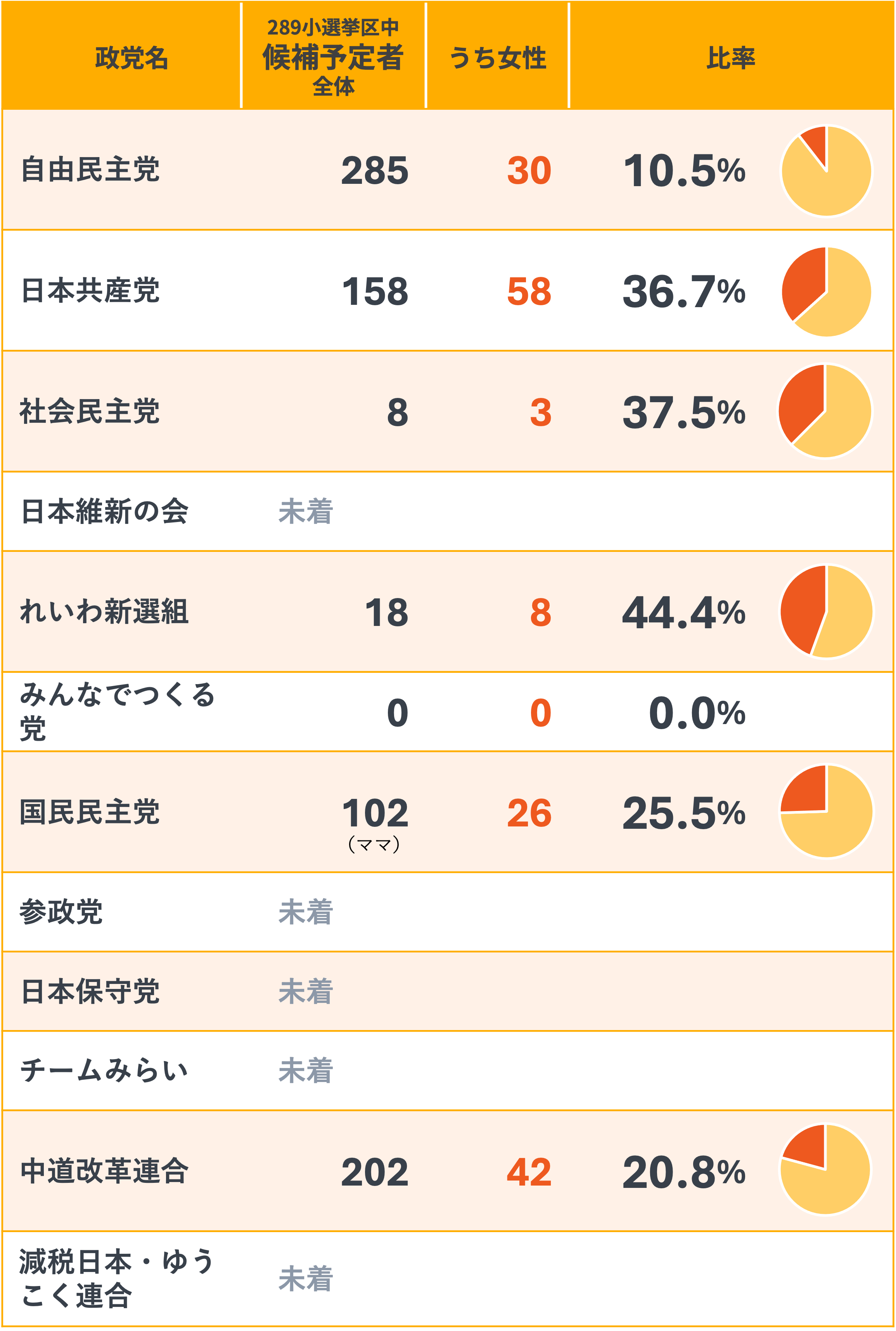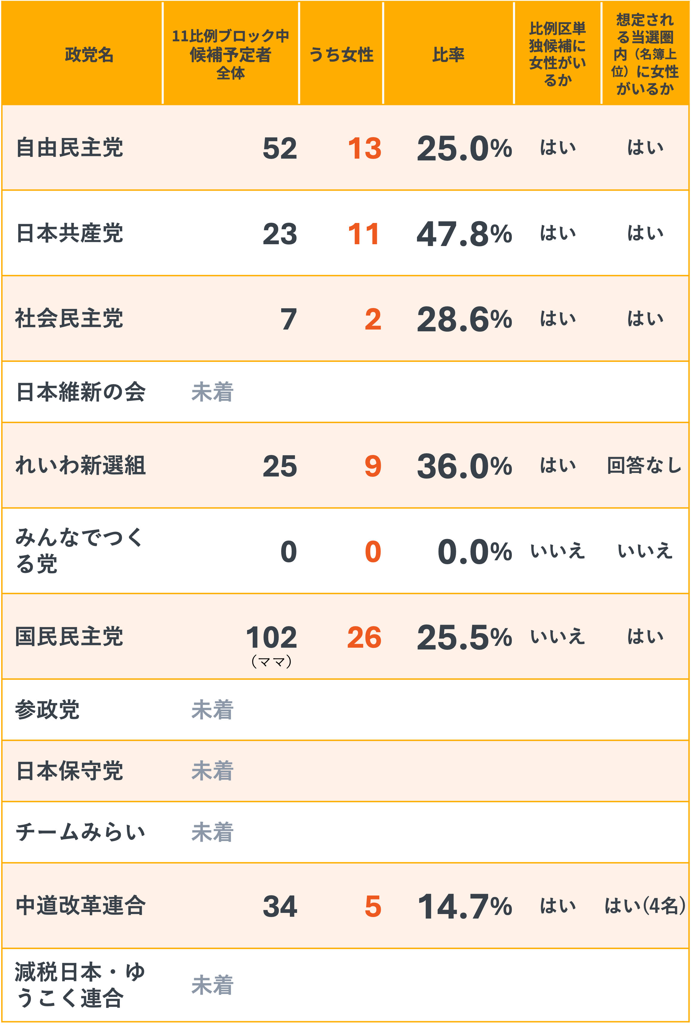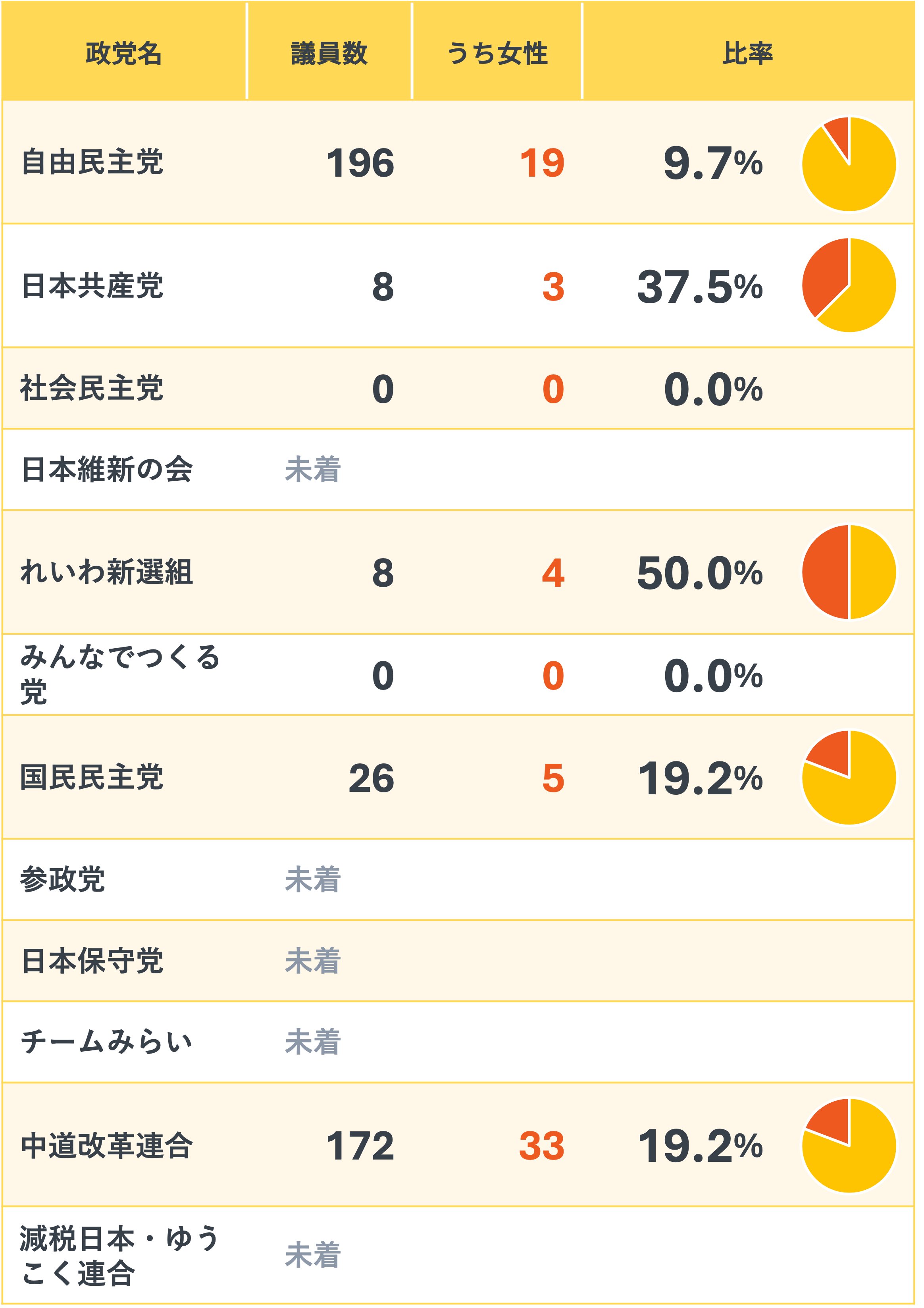 1月22日に結党したため、現時点ではありません。綱領に掲げている「選択肢と可能性を広げる包摂社会の実現」に向け、今後、女性議員の増加を目指すとともに、性別や年齢にかかわらずジェンダー平等を推進する議員を増やし、幅広い層の声が届く国会を実現します。